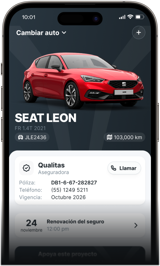 Tu póliza de seguro, tu licencia y todos los datos importantes de tu auto en todo momento.
